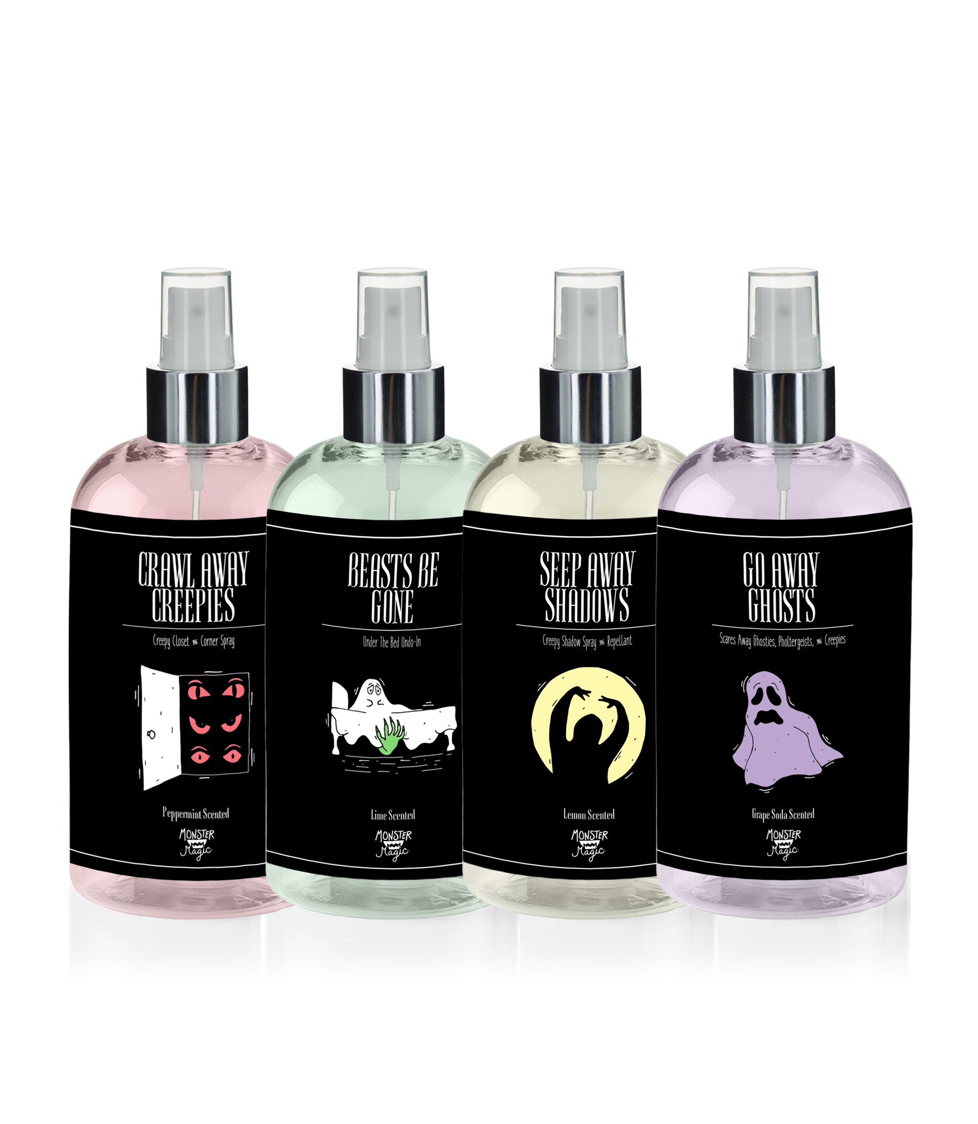 If you can't get enough of Monster Magic, buy all 4! In our Monster Magic Box Set, you'll never have another worry in the world about any Ghosts, Goblins, or Ghouls. Includes: Go Away Ghosts, Seep Away Shadows, Crawl Away Creepies, and Beasts Be Gone scented sprays. With this box set, you'll be living monster free!